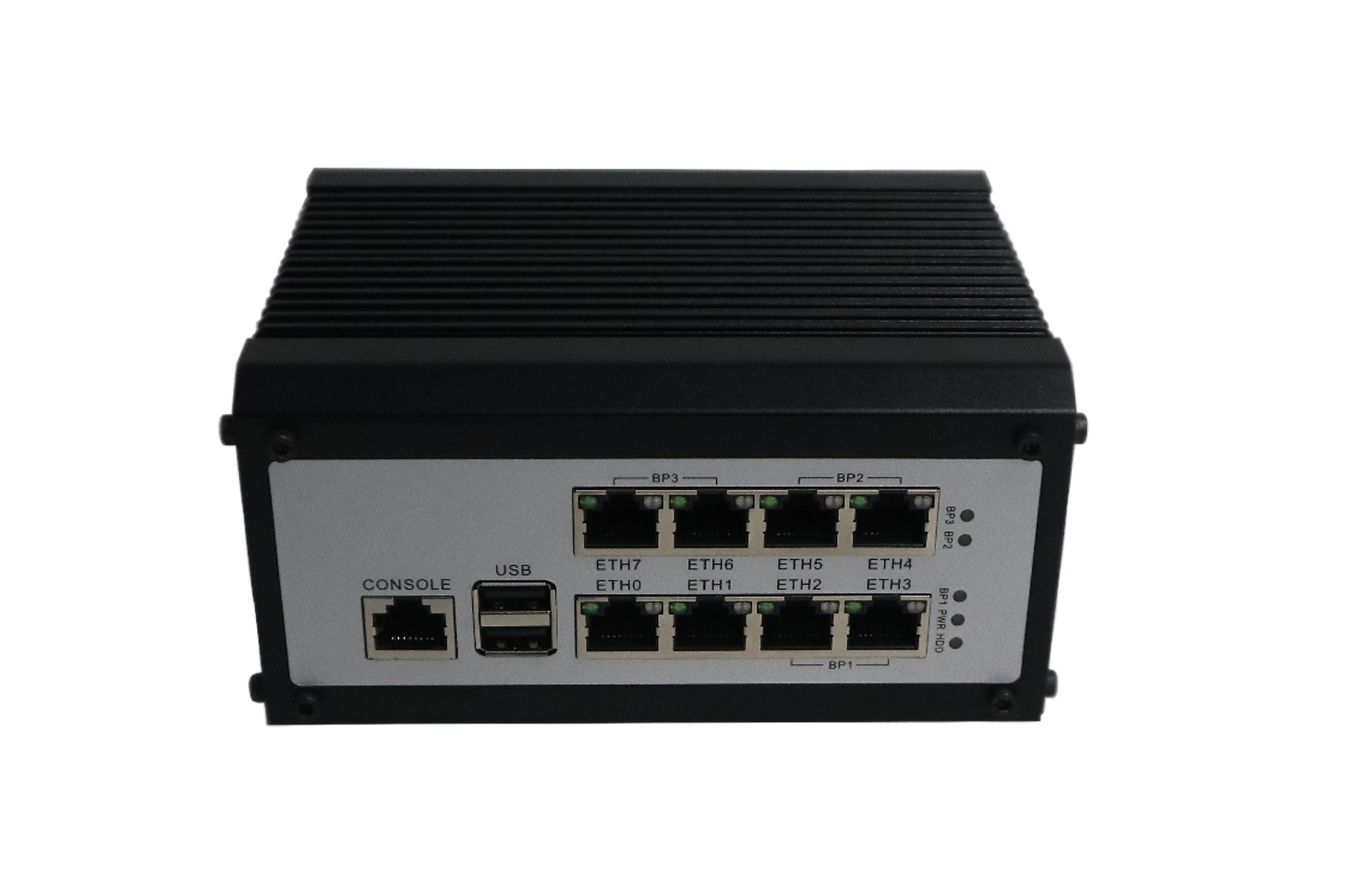导轨式工业网安, 飞腾E2000Q四核处理器,DDR4, 8GB eMMC, 八个千兆电口, 三路BYPASS